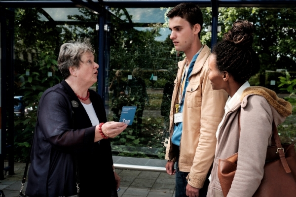 Met behulp van een BlueAssistkaartje kan hij gemakkelijk onderweg studenten of anderen om de weg vragen.
